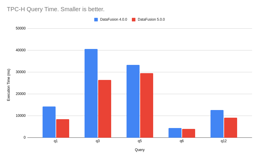 We also extended support for more TPC-H queries: q7, q8, q9 and q13 are running successfully in DataFusion 5.0.