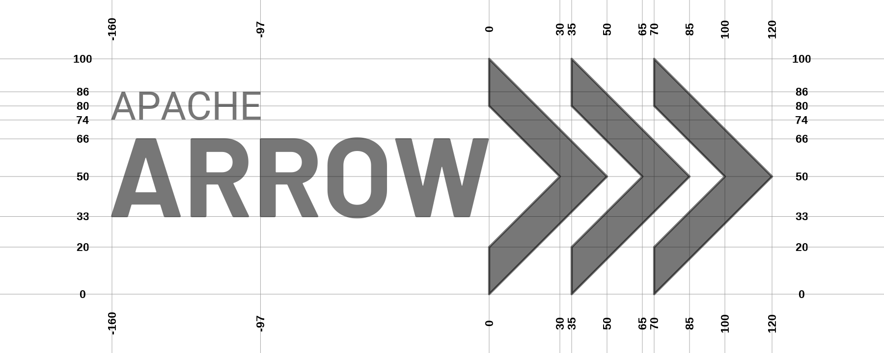 The horizontal midline of the word "Arrow" is aligned with horizontal midline of the chevrons, and the height of the word "Arrow" is approximately 1/3 the total height of the chevrons. Similarly the midline of the word "Apache" is aligned with the upper-inner vertex of the chevrons. The logotype and logomark are placed flush against one another, with the rightmost tip of the "W" in "Arrow" vertically aligned with the leftmost edge of the chevrons.